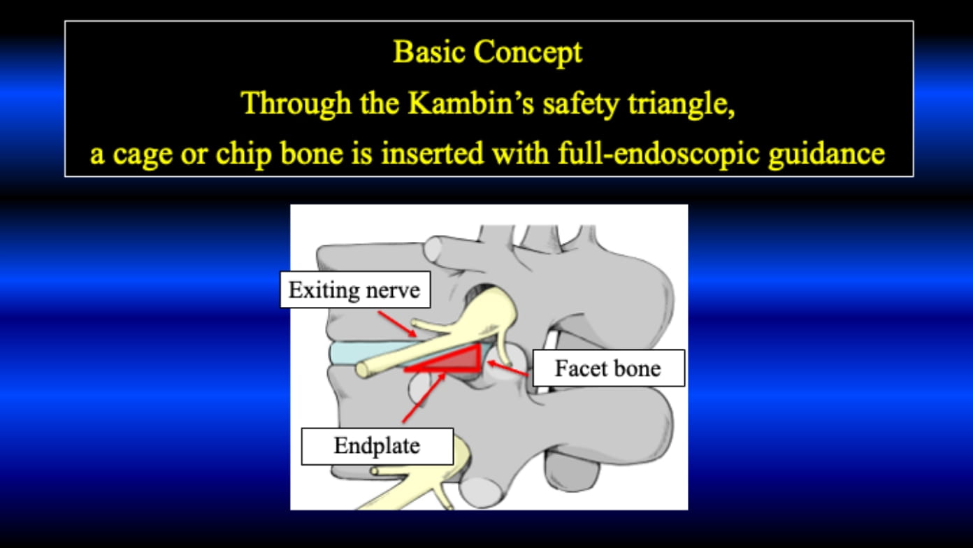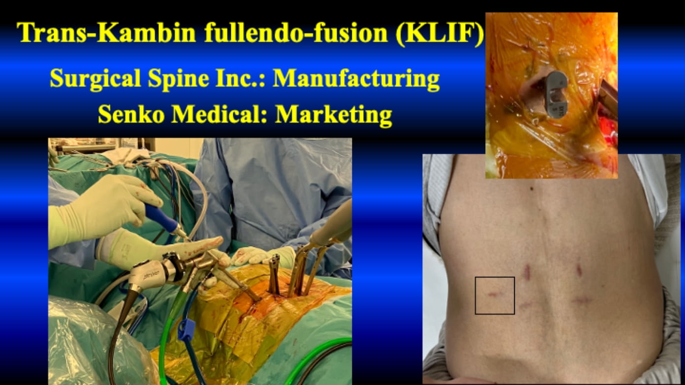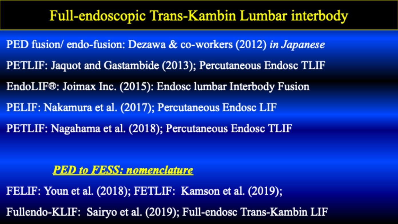 After 2013, percutaneous pedicle screws and cages started to use for the dull-endoscopic fusion. Since then, in the literature, so many reports have been published on the similar technique. The procedure is called as PETLIF, EndoLif, PELIF, FELIF, FETLIF and so one. All procedure is similar as the insertion of the cage through the Kambin triangle; thus, I proposed to use trans-Kambin fusion (KLIF) in 2019.