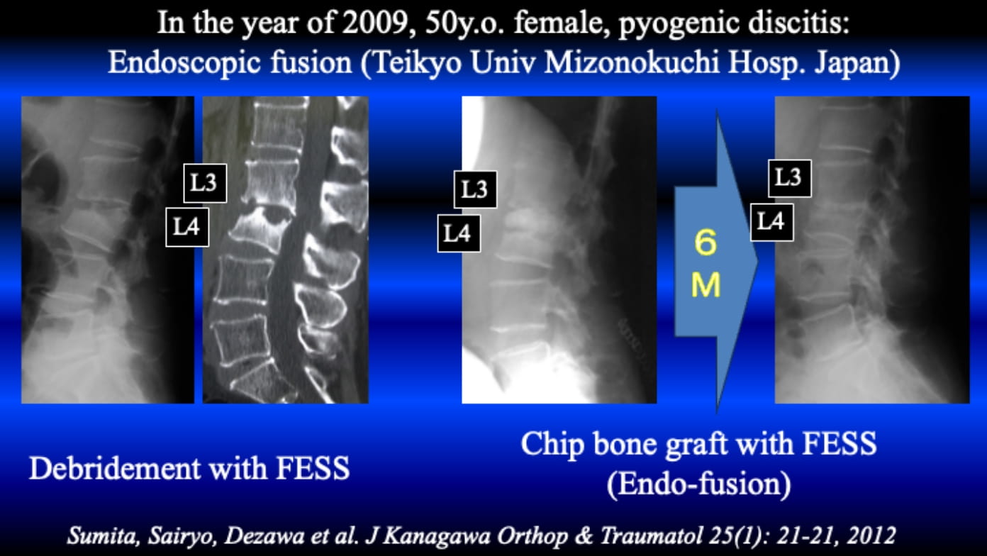 The following case would be the first case in Japan. Full-endoscopic debridement could subside the infection and several weeks later, chip bones were inserted through the Kambin triangle under full-endoscopic guidance in 2009. They called PED-fusion or endo-fusion at the time. They did not use a cage and percutaneous pedicle screws.