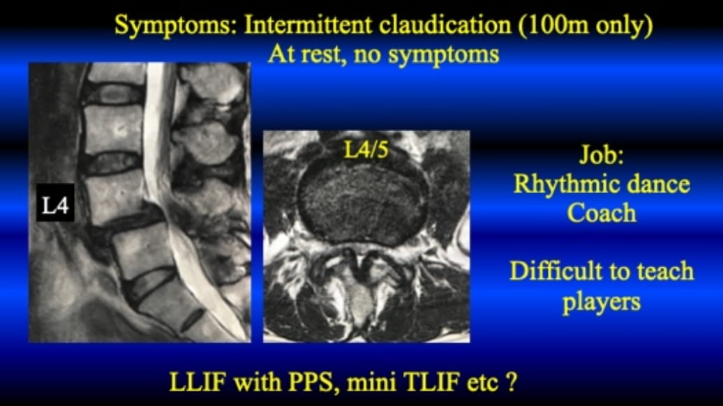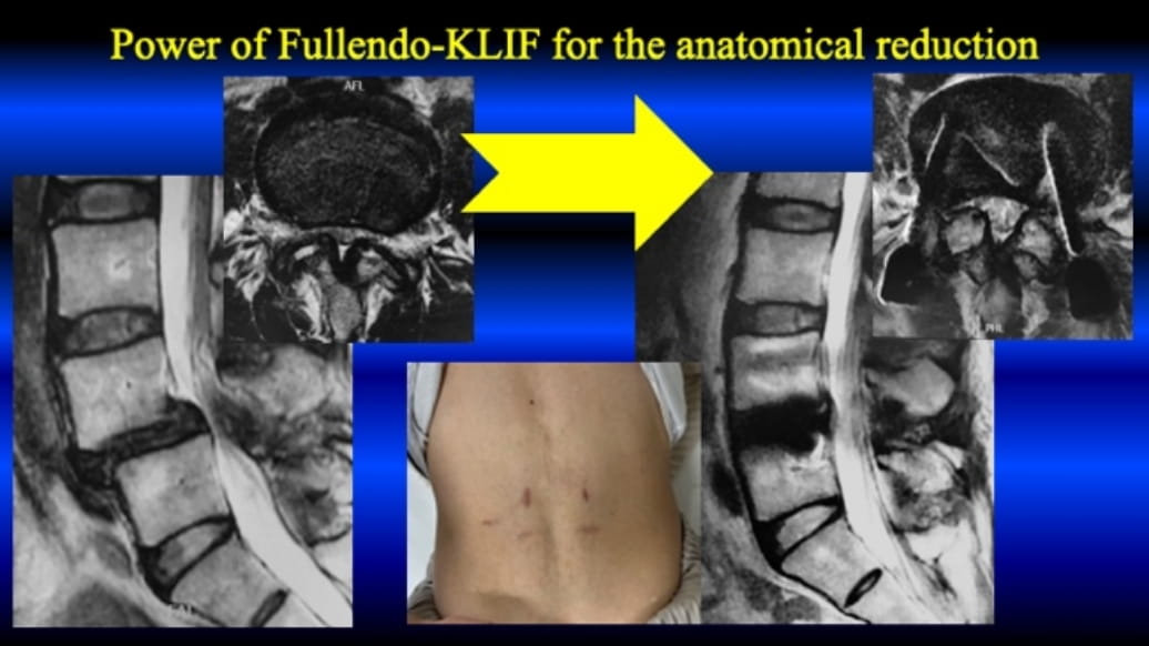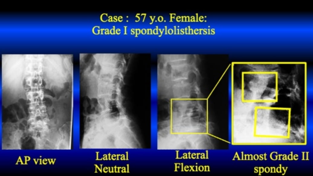 The following case is 57 y.o. female, high school teacher. The slippage in the neutral position is grade I; however, in flexed position it is grade II, almost 30%. Her symptom is just intermittent claudication, and there is no symptom at rest. Thus, FE-KLIF without direct decompression is conducted.