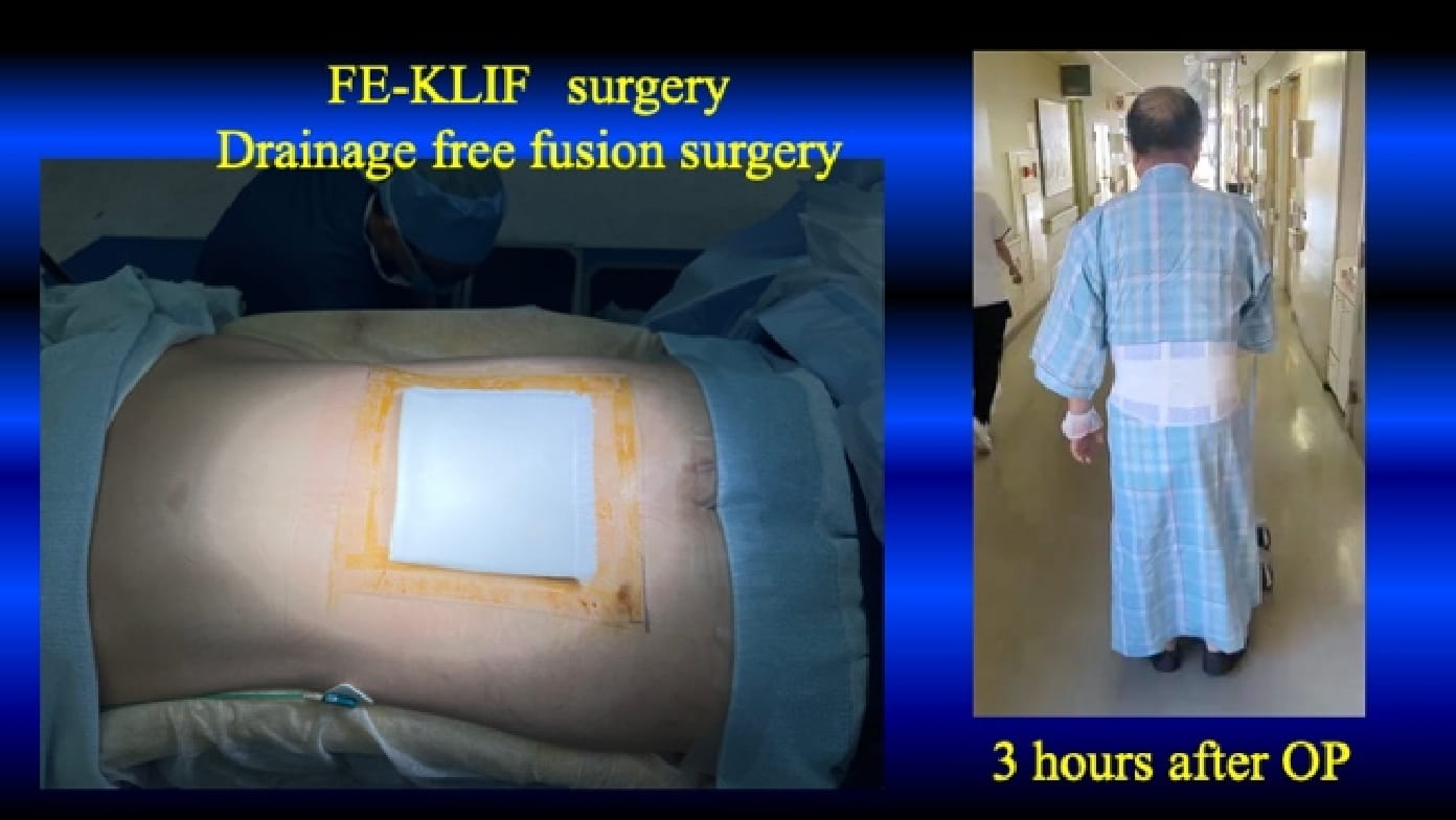 Since FE-KLIF does not require facetectomy and laminectomy, there is no need for worrying about post-surgical hematoma. We do not use drainage after the surgery.