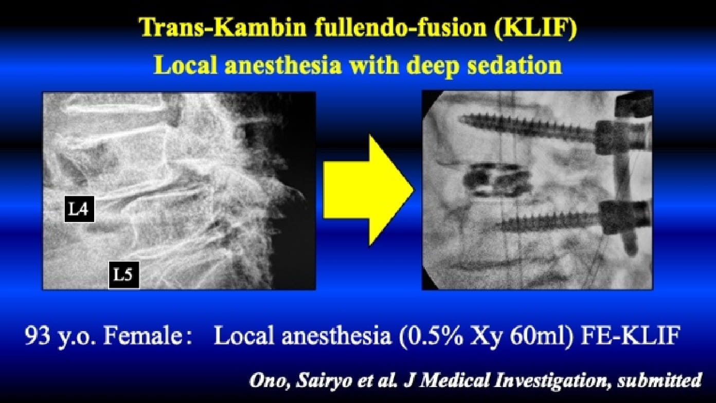 In some countries in the world, trans-Kambin endo-fusion with PPS has been conducted under local anesthesia. However, in Japan, there is no clinical report on the KLIF under local anesthesia. Recently, we conducted such surgery.