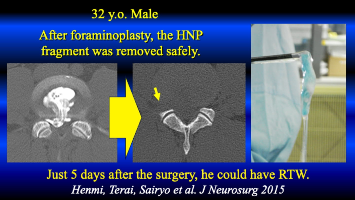 The traditional surgery would be removal of inside mass with Love’s procedure, and outside mass with Wiltse approach under general anesthesia; i.e. two skin incision and very invasive surgery. On the other hand, such HNP can be removed simultaneously via transforaminal access with FESS following foraminotomy. After the surgery, her leg pain completely disappeared and the foot drop was also recovered within 3 months. Successfully, she could be a National Member of Japan, and attended Tokyo Olympic Game 2021.