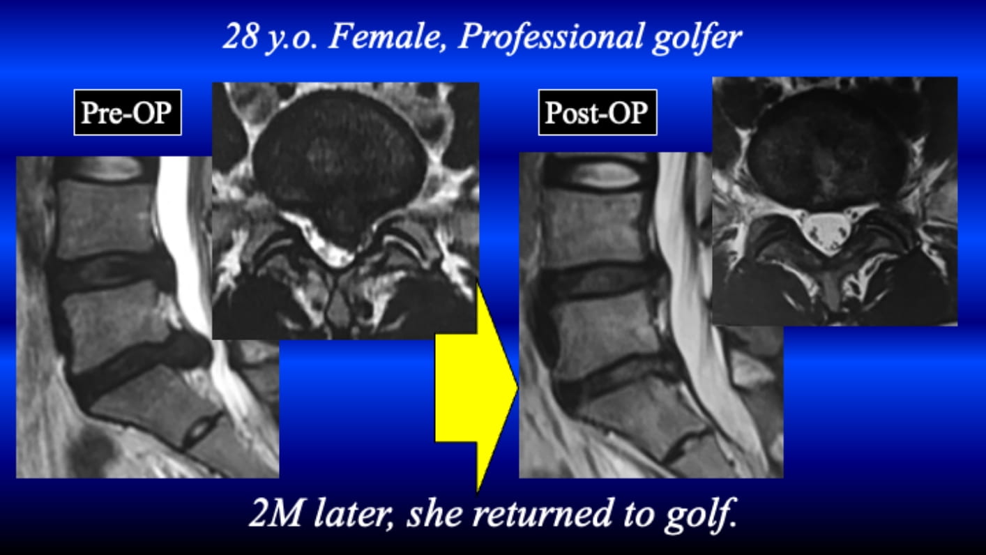 This case is 28 y.o. female professional golfer. She complained severe left leg pain due to HNP at L5/s. The HNP was removed via transforaminal access with FESS following foraminotomy. After the surgery, her leg pain completely disappeared; then, she could return to the original activity 2 months after the TF-FESS.