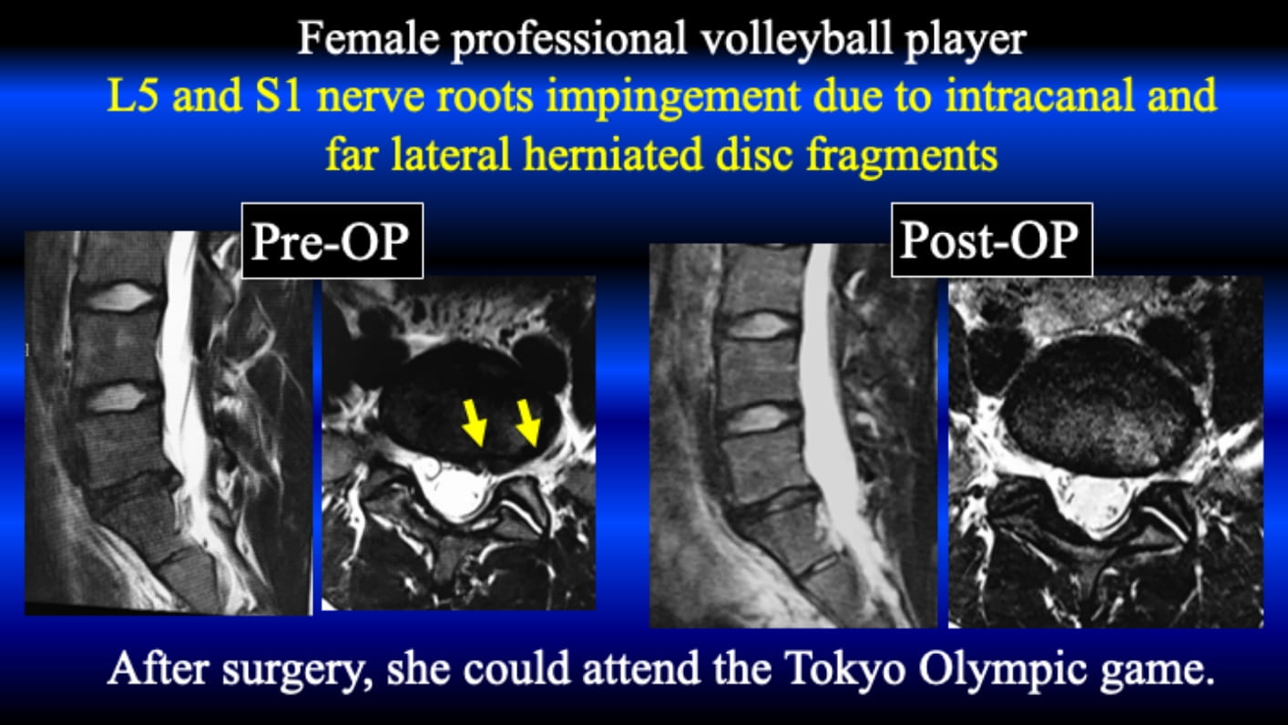 This case is a female professional volleyball player. She attended Rio de Janeiro Olympic Game, and after coming back to Japan she felt severe left leg pain due to HNP at L5/s. The HNP locates inside of the canal and pushes S1 nerve root. Furthermore, the HNP mass extrudes to the far lateral area, leading L5 radiculopathy (foot drop).