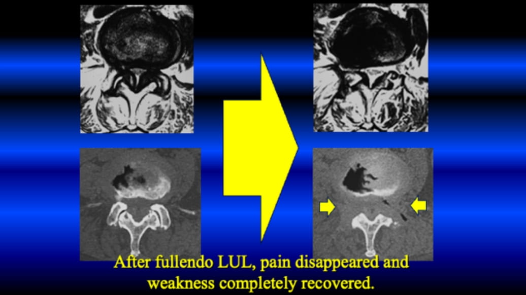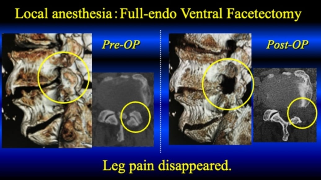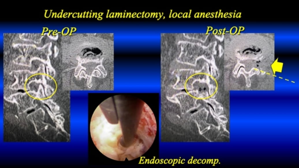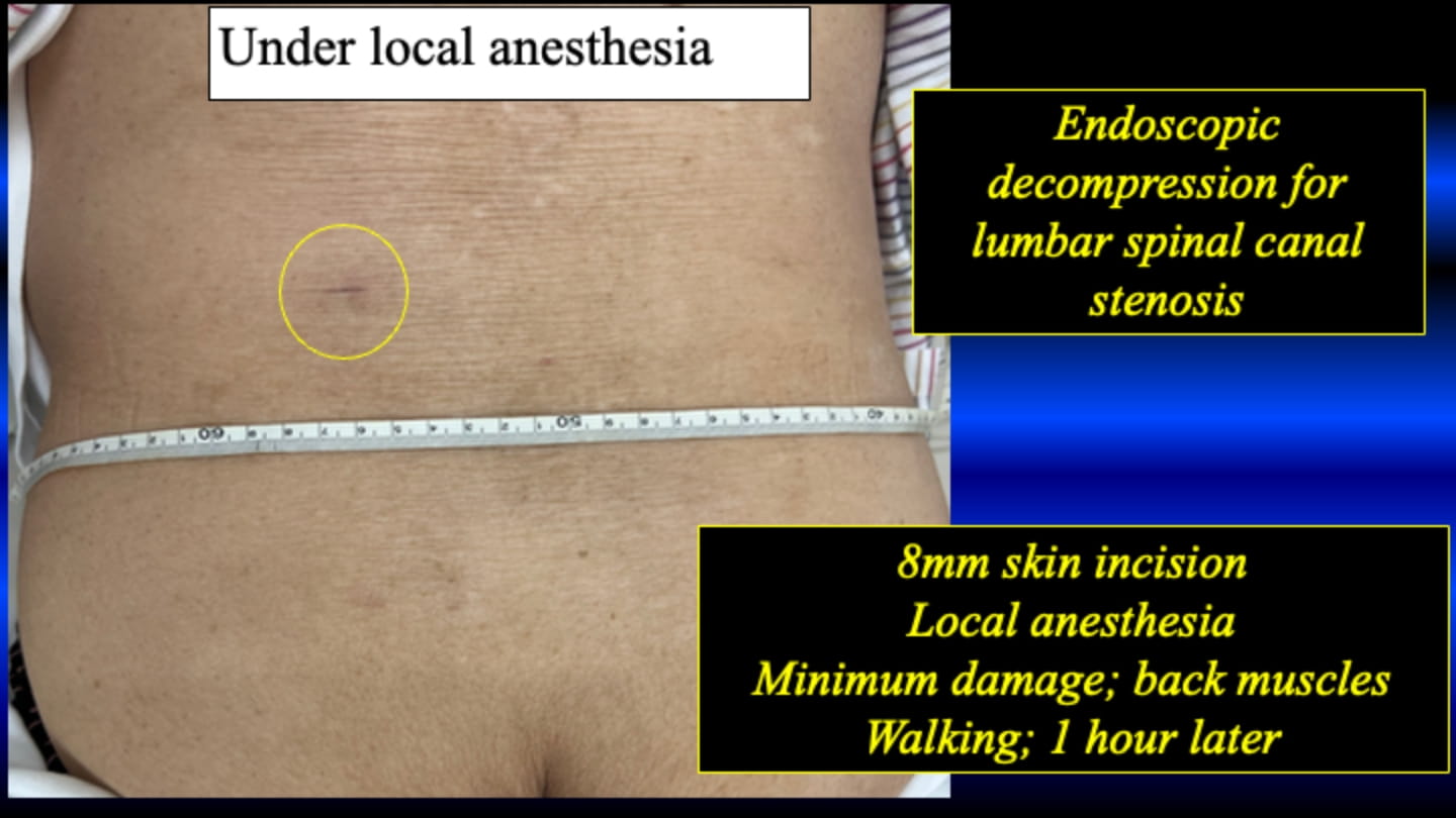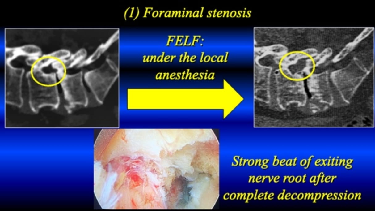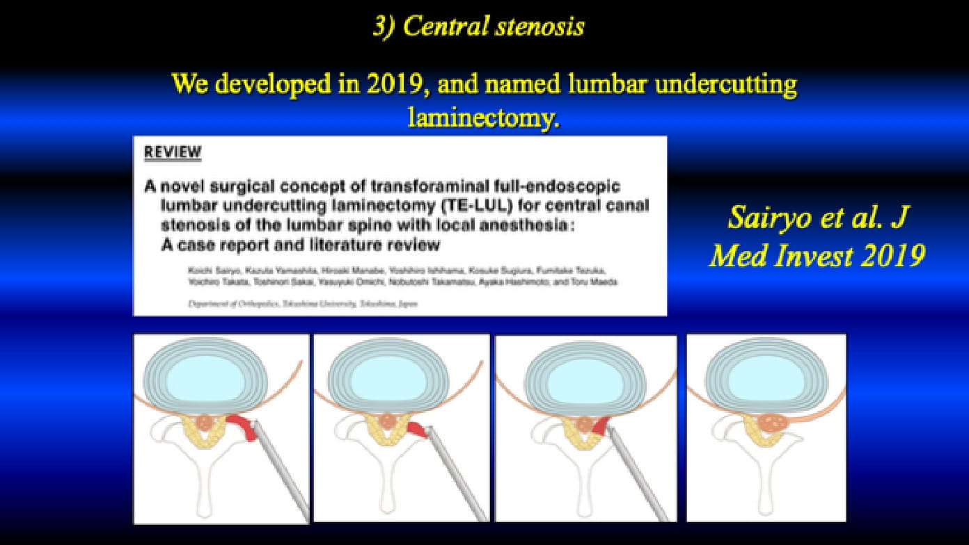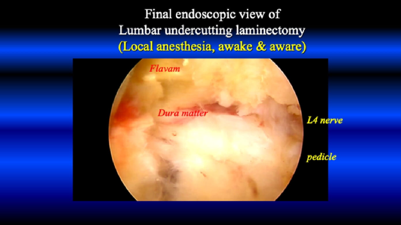 Please see the below. The TF-FESS surgery under local anesthesia initiated by discectomy of the herniated nucleus pulposus. Now, the procedure can be applied for all three types of the lumbar spinal canal stenosis under local anesthesia.