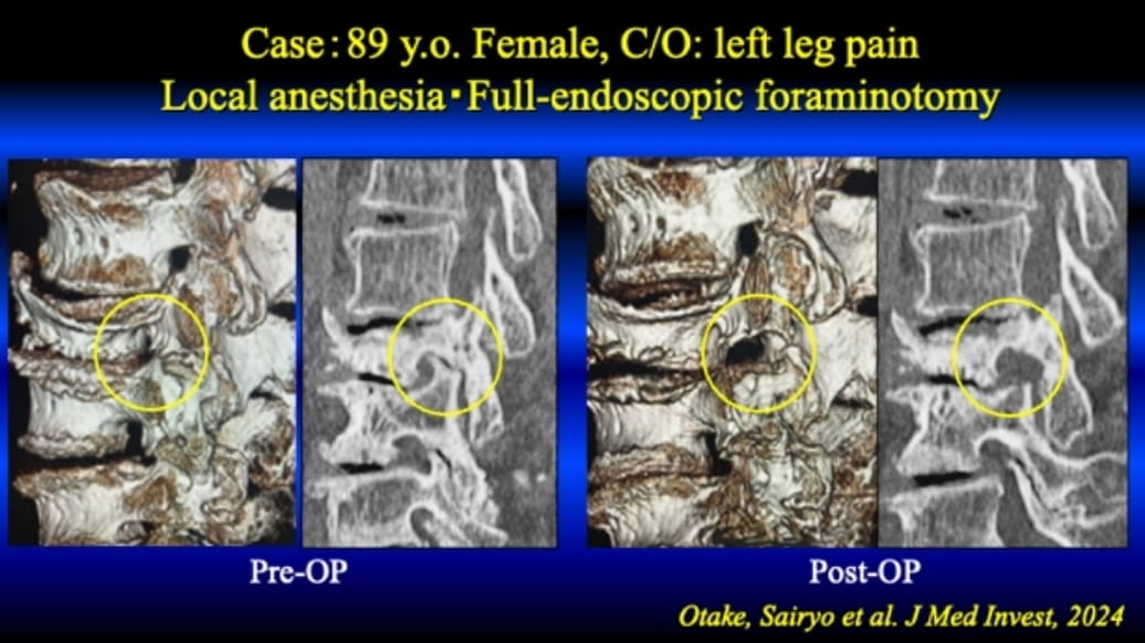 This representable case is a 89 years old female. Four years ago, she had vertebral body fracture, and it was healed with conservative treatment. Although vertebral body was collapsed, severe low back pain was disappeared. Instead, let high pain appeared. Since her cardiac function was very poor, and her age was very elderly, her local surgeons did not recommend surgical intervention with general anesthesia. Then, she was referred to us. Under local anesthesia, her narrow foramen was successfully enlarged by TF-FESS (foraminotomy), and her leg pain disappeared. Please see the figures below, and the circle indicates the change of the foramen before and after surgery.