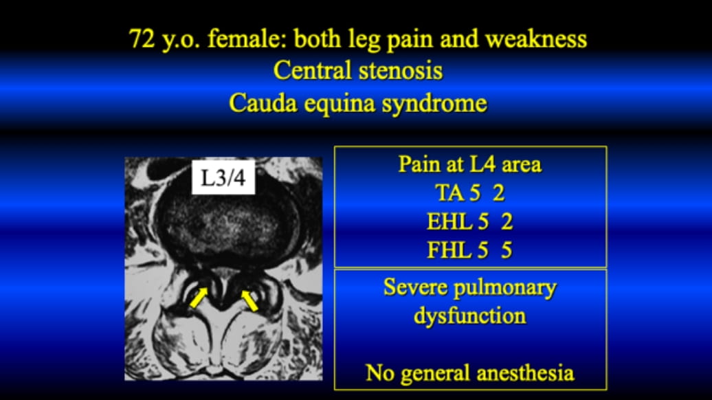 This case is 72 years old female, and visited us with both leg pain and muscle weakness at the left side. Interlaminar decompression as ‘laminectomy’ was planned under general anesthesia; however, her pulmonary function was very poor. The laminectomy was cancelled; then, TE-LUL under local anesthesia was conducted instead. After bilateral decompression, her both leg pain was disappeared and the muscle weakness was improved completely within 3 months.