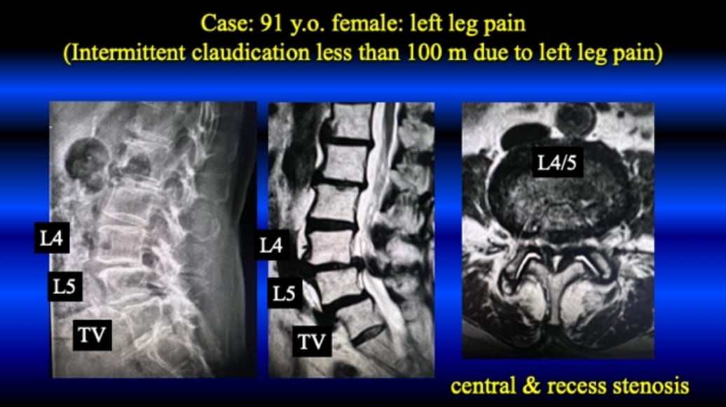This representable case is 90 years old male. He visited many local doctors with complaining of the left leg pain. Since he is very old (90 y.o.) and he has general complications; thus, no one recommended surgery. He could not tolerate the pain, and he visited us for the purpose of the surgery under local anesthesia. His left leg pain was induced by the lateral recess stenosis, and FEVF was conducted successfully. His symptoms was completely disappeared after the surgery.